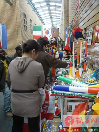 穿行在這里的商鋪之間,安全感和親切感倍增,到處是黃皮膚黑頭發(fā),還有不時(shí)會(huì)飄送過來的鄉(xiāng)音。商城中的狂歡氣氛相當(dāng)濃重,所有的走道里扎滿了世界杯32強(qiáng)的國旗。商鋪中最受歡迎的也是售賣世界杯相關(guān)商品的,每走幾步,就可以看到許多非華人的買家聚集在售賣球衣、球服、大喇叭的攤位前問價(jià),而站在旁拍照的記者,竟因?yàn)殚L著華人的面孔,被屢屢誤認(rèn)為是老板,遭問了不下十幾次“這個(gè)值多少錢?”實(shí)際上,世界杯官方的球衣和紀(jì)念品幾乎全都是中國制造的,當(dāng)然,百家商城里出售的商品多數(shù)是沒有授權(quán)的“山寨版”,比正版貨的價(jià)格便宜數(shù)倍,因此南非各地的人,也有不少專程跑到中國城來批發(fā)便宜貨?磥,世界杯又能讓南非華人大賺一筆了。(底婕)