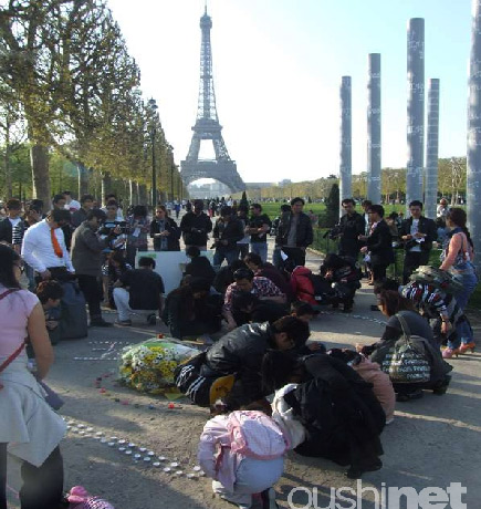 數(shù)百名在法留學生和華人于18日在巴黎艾爾菲鐵塔前的和平墻點起蠟燭,為青海玉樹地震的遇難者祈福。他們將數(shù)百支蠟燭擺成巨大的心形和“玉樹”字樣,然后逐一將蠟燭點燃,與此同時,祈福板上也留下他們各式的祝福語,表達自己對災區(qū)同胞們血脈相連的感情。望著燃燒的蠟燭,留學生和華人高呼“玉樹加油”,衷心的祈求青海玉樹地震中的生者平安,死者安息;顒游簧俾愤^的法國人和游人也停下腳步,為玉樹地震的死難者哀悼。