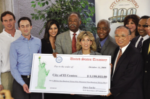 中新網(wǎng)10月16日電 據(jù)美國《僑報》報道,美國經(jīng)濟(jì)蕭條還沒有走出低谷,聯(lián)邦財政預(yù)算捉襟見肘。14日在帝王郡艾爾森特市政府(El Centro, Imperial County)舉行頒獎典禮,聯(lián)邦商務(wù)部經(jīng)濟(jì)發(fā)展局(EDA)表彰華裔開發(fā)商美國YK集團(tuán)(YK America Group),對美國經(jīng)濟(jì)和創(chuàng)造就業(yè)的貢獻(xiàn),并獎勵給他們由商務(wù)部長駱家輝簽名的320萬美元支票,用于商業(yè)開發(fā)區(qū)水電和道路的基礎(chǔ)建設(shè)。