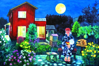 黑藍(lán)色的夜空,掛著冰鏡碧玉般的月亮,柔柔的月光下,一個穿著藍(lán)底白花夏日和服(浴衣)的日本女性,坐在院子里長滿鮮花綠草的木桌旁,桌子上放著一封開啟的信件,她的眼神是寂寞、憂傷,是祈念、期待。她在等待誰?又在祝福誰?畫的題目是“但愿人長久”。