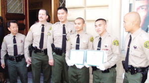 上午10點(diǎn)畢業(yè)典禮開始,洛縣警局局長李貝卡親自為70名新警員頒發(fā)畢業(yè)證書,在這些人當(dāng)中,有4人是亞裔,其中包括一名韓裔、一名越裔和兩名華裔,這兩人分別是26歲的何青源和25歲的陳得光。兩人在家人和朋友的簇?fù)硐嘛@得格外的自豪,并在洛縣警局華裔警官何思棋的陪同下一起合影留念。