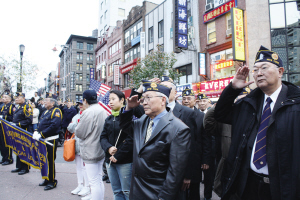下午,紐約華裔美國退伍軍人會在華埠華裔軍人忠烈坊舉行另一個紀(jì)念儀式--向華裔軍人獻(xiàn)上花圈,呼吁人們勿忘華裔軍人對美國作出的貢獻(xiàn)。