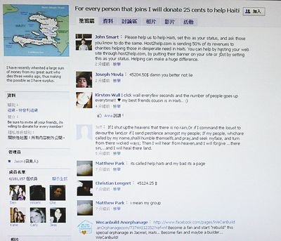 事實(shí)上,王Jason并不是唯一發(fā)起該行動(dòng)的人或組織,在Facebook網(wǎng)站,在搜索欄輸入英文Haiti,就會(huì)顯示2800個(gè)相關(guān)搜索結(jié)果,有的群組主旨和王Jason發(fā)起的類似,比如“該群組每加入一個(gè)人我就捐0.05美分幫助海地”、“該群組每加入一個(gè)人我就捐10美元幫助海地”,區(qū)別只是捐助金額的不同,但目前加入王Jason創(chuàng)立的群組人數(shù)最多。