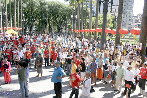 6日上午,圣保羅市中心SE 廣場四周懸掛數(shù)十個巨型大紅燈籠,古老的大教堂前臨時搭起了舞臺,臺上貼有中國春聯(lián)掛有中國結(jié)等節(jié)日吉祥物,組合音響播放著喜慶的中國民樂,廣場一側(cè)設(shè)有中國文化藝術(shù)攤位,廣場上一派節(jié)日的歡快喜慶景象。
