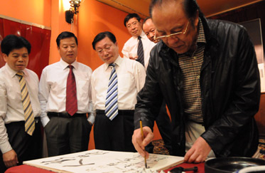 晚宴上,著名歌唱家楊洪基揮毫灑墨,為阿根廷華人華僑聯(lián)合總會題字,代表團(tuán)成員也一一落款簽字。
