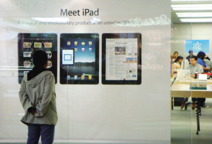 自從上周六iPad開始上市以來(lái),洛杉磯各地蘋果店熱銷這款蘋果家族最新產(chǎn)品,有的店甚至出現(xiàn)了連夜大排長(zhǎng)龍的壯觀景象。本周一許多蘋果電中的顧客仍然川流不息,許多都是慕名而來(lái)想一睹iPad的風(fēng)采。