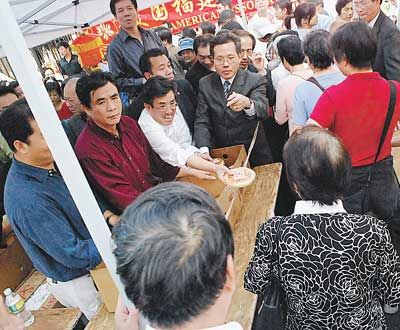 中新網(wǎng)9月23日電 據(jù)美國(guó)《世界日?qǐng)?bào)》報(bào)道,今年的農(nóng)歷中秋佳節(jié)落在10月3日,美國(guó)福建同鄉(xiāng)會(huì)21日與20多個(gè)社團(tuán)和政府部門(mén)在紐約曼哈頓華埠舉行盛大的“中秋福建街坊節(jié)”,吸引超過(guò)5000民眾參加,其中大部分為閩籍鄉(xiāng)親,也有不少非華裔民眾湊熱鬧。福建同鄉(xiāng)會(huì)并在下午為鄉(xiāng)親派發(fā)福建的傳統(tǒng)月餅,共派出1500多份,眾多鄉(xiāng)親開(kāi)心排隊(duì)領(lǐng)取。