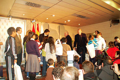 中新網(wǎng)12月26日電 據(jù)西班牙《歐華報(bào)》報(bào)道,由皇馬基金會(huì)發(fā)起“每個(gè)孩子都有玩具”的活動(dòng),日前在馬德里伯納烏球場內(nèi)舉行。皇馬現(xiàn)役超級球星卡卡,及退役球星齊達(dá)內(nèi)到場給馬德里兒童代表送出“第一份”圣誕節(jié)禮物。毛尚雅等4名華裔小朋友作為馬德里華僑子女代表,參觀了皇馬博物館、伯納烏球場及球員休息室等地,并在活動(dòng)中上臺(tái)領(lǐng)取禮物,接受電視臺(tái)采訪。