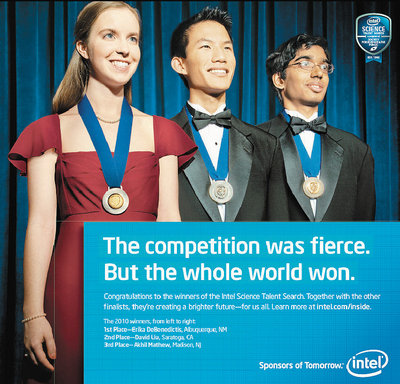 英特爾在廣告中的標(biāo)題及內(nèi)容都很簡(jiǎn)單。標(biāo)題為“科學(xué)獎(jiǎng)競(jìng)爭(zhēng)激烈,贏家是全世界!睆V告內(nèi)容指出,恭賀所有在英特爾科學(xué)獎(jiǎng)的優(yōu)勝者及進(jìn)入最后準(zhǔn)決賽參賽者,他們創(chuàng)造了更光明的未來(lái)。