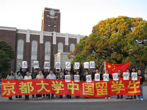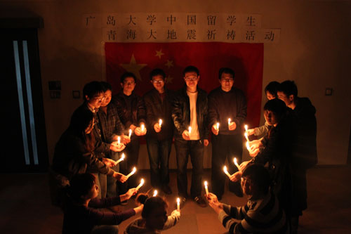 中新網(wǎng)4月20日電 據(jù)日本《關(guān)西華文時(shí)報(bào)》報(bào)道,4月18日,日本京都大學(xué)和廣島大學(xué)中國(guó)留學(xué)生學(xué)友會(huì)舉辦各種活動(dòng),為青海地震遇難者祈福。日本京都大學(xué)的中國(guó)留學(xué)生在京都大學(xué)廣場(chǎng)高舉五星紅旗和條幅“玉樹挺住,心在一起,祖國(guó)安康,天佑中華!睆V島大學(xué)中國(guó)留學(xué)生學(xué)友會(huì)的留學(xué)生點(diǎn)燃蠟燭為青海地震遇難者祈福。(渡邊)