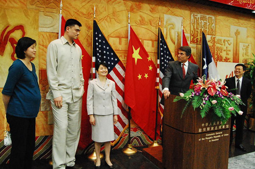 中新網(wǎng)4月28日電 據(jù)美國《美中信使報》報道,中國駐休斯頓總領(lǐng)事高燕平與美國德克薩斯州州長里克.佩里于當(dāng)?shù)貢r間27日下午5時在總領(lǐng)館會議大廳舉辦“慶祝上海世博會和中國-得州友好關(guān)系”招待會。擔(dān)任上海世博會形象大使的中國著名籃球明星姚明和他的妻子葉莉以及當(dāng)?shù)厝A人僑領(lǐng)及學(xué)界代表200余人應(yīng)邀出席招待會。