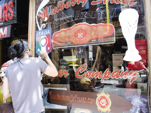 逛小意區(qū)時,看見一個禮品店小伙子在門外圖畫意大利隊隊徽和大力神杯。一名賣球衣的華人表示,雖然現(xiàn)在小意區(qū)還不太“熱”,但到意大利隊出場那天,整個小意區(qū)都會瘋起來,那時球衣就好賣了。