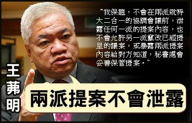 中新網(wǎng)9月9日電 據(jù)馬來(lái)西亞《星洲日?qǐng)?bào)》報(bào)道,馬華總秘書(shū)王茀明8日說(shuō),他保證不會(huì)在兩派就特大二合一的協(xié)調(diào)會(huì)議前,泄露任何一派的提案內(nèi)容,甚至允許另一派竄改已經(jīng)提呈的議案,或暴露兩派提案內(nèi)容給對(duì)方知道。