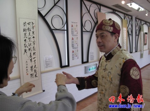 這位濃眉大眼的大漢,是湖南岳陽(yáng)人,眉宇間有一股坦蕩之氣逼人?傋尮P者懷疑是武林中人。就是這位,自2001年來(lái)日本傳播指書(shū)文化,短短10年間,已是列島上下,上至國(guó)家政要,下至普通市民,爭(zhēng)相結(jié)交的人氣者。