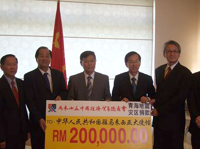 中新網(wǎng)5月6日電 據(jù)中國(guó)外交部網(wǎng)站消息,近日,馬來西亞馬中經(jīng)貿(mào)總商會(huì)、馬華公會(huì)公共服務(wù)及投訴局以及華商Yap Kim San 先生前來中國(guó)駐馬來西亞使館,轉(zhuǎn)交向青海玉樹地震災(zāi)區(qū)捐款。