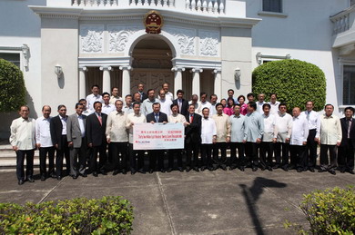 菲律賓商聯(lián)總會(huì)理事長(zhǎng)黃禎潭、菲華各界聯(lián)合會(huì)主席戴宏達(dá)一行4日上午來(lái)到中國(guó)駐菲使館,親手向劉建超大使遞交了由這兩個(gè)菲華社團(tuán)發(fā)動(dòng)當(dāng)?shù)厝A人華僑為玉樹災(zāi)區(qū)籌得的善款3287.7萬(wàn)比索(約合500萬(wàn)元人民幣)。