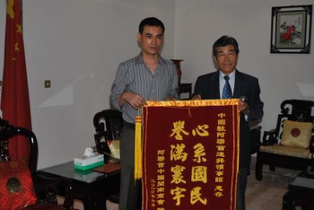 施福建家屬對施遇害后,總領(lǐng)館即派員與警方交涉并協(xié)助家屬迅速處理死者后事表示感謝。高總領(lǐng)事感謝家屬對總領(lǐng)館工作的肯定,并強(qiáng)調(diào),錦旗是對總領(lǐng)館工作的鼓勵,總領(lǐng)館將一如既往地堅持以人為本、外交為民的理念,加大與阿司法機(jī)構(gòu)合作力度,努力保障在阿中國公民的人身和財產(chǎn)安全。