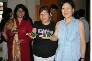 當(dāng)把專門從國(guó)內(nèi)帶來(lái)的蘆葦葉準(zhǔn)備好后,印度朋友們都紛紛圍到廚師身旁,饒有興致地學(xué)習(xí)包粽子,仔細(xì)地詢問(wèn)如何鋪葉、卷葉、捆扎等細(xì)節(jié),并動(dòng)手制作。粽子煮熟后,印度朋友們高興地品嘗了她們稱之為“中國(guó)布丁”的美食,并稱贊粽子味道很美。