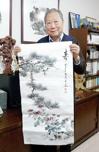 周士心大師為賑災(zāi)而畫的《壽松》。(加拿大《明報》)