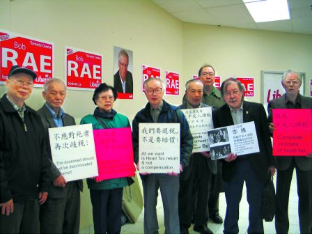 人頭稅苦主及家屬聯(lián)盟昨日前往李博的競選辦公室請(qǐng)?jiān)。(加拿大《明?bào)》)