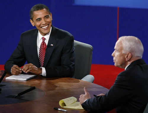 美國(guó)共和黨總統(tǒng)候選人麥凱恩和民主黨總統(tǒng)候選人奧巴馬于美東時(shí)間10月15日晚上9時(shí)(北京時(shí)間16日早上9時(shí))在紐約霍夫斯特拉大學(xué)展開(kāi)總統(tǒng)選舉投票前的最后一場(chǎng)電視辯論。雙方坐在同一張桌子前就各自的經(jīng)濟(jì)計(jì)劃展開(kāi)唇槍舌戰(zhàn)。