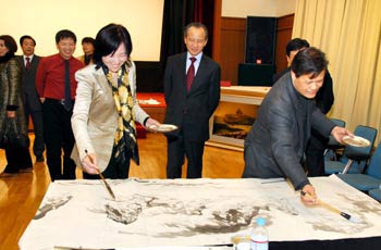 全日本華人書法家協(xié)會(huì)主席劉洪友代表藝術(shù)家們感謝使館舉辦溫馨親切的元宵節(jié)招待會(huì),感謝使館長期以來對(duì)海外藝術(shù)家的支持。他呼吁大家廣集才智、團(tuán)結(jié)一心,為祖國的進(jìn)一步繁榮昌盛貢獻(xiàn)自己的力量。劉洪友還特別提到了今年國內(nèi)南方的雨雪冰凍災(zāi)害,倡議大家關(guān)心災(zāi)區(qū),并以“在日華人文聯(lián)籌委會(huì)”的名義,帶頭捐款,為災(zāi)區(qū)獻(xiàn)上了一份愛心。