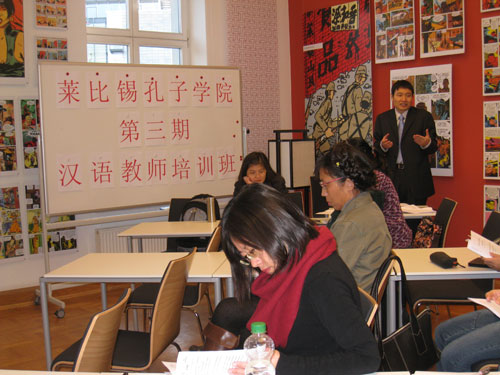 本期培訓班的主講是萊比錫孔子學院對外漢語教師高永安。他結合德語、漢語的語音比較,講述了對德漢語教學中的語音教學技巧;結合漢語的詞匯特點,講述了詞匯教學的主要方法,并重點介紹了語素教學法。參加培訓的教師們對課堂內容很感興趣,他們一邊聽講,一邊提問題,課堂氣氛十分活躍。學員們還分享了各自在教學實踐中的經驗,探討了教學中出現(xiàn)的問題,并共同尋求解決的辦法。