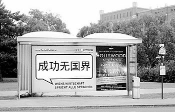 近日,奧地利維也納街頭出現(xiàn)了一些漢字廣告。隨著中國國際影響的增加,奧地利人對中國的關(guān)注度和對中國文化的興趣也在不斷上升。維也納大學(xué)漢學(xué)系的學(xué)生從中國改革開放前的約50人激增到現(xiàn)在的約700人;奧地利的漢語教學(xué)機構(gòu)從維也納大學(xué)漢學(xué)系1家增加到現(xiàn)在的約70家;通過各種方式學(xué)習(xí)漢語的有數(shù)千人。當?shù)亟逃块T已在考慮將漢語列入中學(xué)的教學(xué)大綱。正是在這一背景下,漢字廣告牌出現(xiàn)在維也納街頭。圖為10月8日維也納南火車站旁一個公共車站的廣告牌,上面張貼著維也納商會的廣告“成功無國界”。(方祥生 攝)