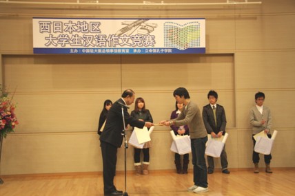 12月20日,中國駐大阪總領(lǐng)事館教育室在立命館大學(xué)舉行了西日本地區(qū)大學(xué)生中文作文比賽頒獎儀式。教育室主任劉占山為獲得一等獎的神戶市立外國語大學(xué)的渡部恒介同學(xué)頒發(fā)了榮譽證書和三萬元的圖書卡獎品。立命館孔子學(xué)院院長周瑋生為獲得二等獎的龍谷大學(xué)的北村籃子和關(guān)西外國語大學(xué)的增瀨有佑同學(xué)頒發(fā)了榮譽證書和一萬元的圖書卡。獲得三等獎的同學(xué)有龍谷大學(xué)的韓國留學(xué)生權(quán)純睦、神戶市外國語大學(xué)的油谷優(yōu)太、京都外國語大學(xué)相川瑞穗和神戶松蔭女子大學(xué)的古川翠。