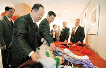 圖為廣東僑辦主任吳銳成(左二)拜會(huì)中華文化中心,捐贈(zèng)多件蒙古族傳統(tǒng)服裝。((關(guān)文杰 攝)