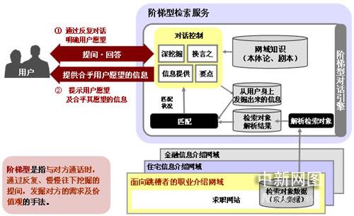 沖電氣與RECRUIT,共同開發(fā)設(shè)計了通過計算機(jī)向用戶提問,發(fā)掘用戶獨(dú)自無法表達(dá)的愿望及需求,從各種各樣大量的服務(wù)及內(nèi)容中找出與之匹配信息的“階梯型檢索服務(wù)”。去年本服務(wù)已經(jīng)被“信息大航海項目”作為模型服務(wù)之一所采納,進(jìn)行了圍繞階梯型對話引擎的系統(tǒng)技術(shù)開發(fā),在以約800用戶為對象的向跳槽者介紹職業(yè)的網(wǎng)域進(jìn)行了驗證試驗。結(jié)果表明,與用戶平均進(jìn)行了33次對話(系統(tǒng)提問,用戶回答后算一次對話),可以平均從用戶獲得32個屬性的信息。同時進(jìn)行了問卷調(diào)查,24%的用戶回答通過對話得到了提示,了解了自己的需求,驗證了通過與計算機(jī)對話,能發(fā)掘用戶自身沒有注意的需求。而且,沖電氣還從中獲知可以對該服務(wù)寄予極大期望,期待目前有54%,兩年后有75%的用戶能使用該服務(wù)。
