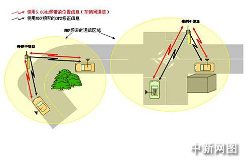 使用5.8GHz頻帶的DSRC車輛間通信功能交換位置信息。另一方面,今后,發(fā)送來自路側(cè)中繼器的GPS修正信息可以使用能被應(yīng)用于ITS的UHF頻帶。