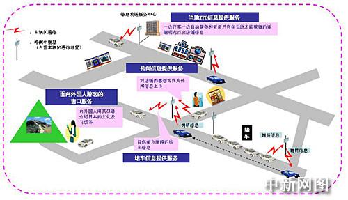 本系統(tǒng)考慮了信息通信基礎(chǔ)設(shè)施不十分完備的旅游觀光地的地域特性,在無線基站沒有聯(lián)網(wǎng)的情況下,也能靈活運(yùn)用以車輛間通信技術(shù)為基礎(chǔ)的“車輛傳輸信息,以及車輛間直接構(gòu)成網(wǎng)絡(luò)”功能,提供:①當(dāng)?shù)豑PO信息提供服務(wù);②傳聞信息提供服務(wù);③堵車信息提供服務(wù);④面向外國人旅游觀光客的向?qū)Х⻊?wù)等與旅游司機(jī)需求相匹配的信息。