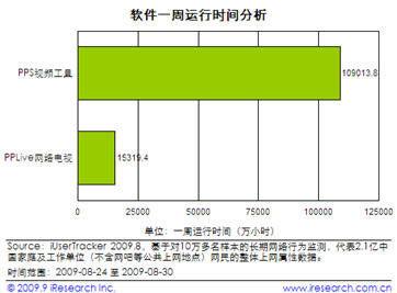 除了用戶覆蓋量,廣告主關(guān)心的莫過(guò)于網(wǎng)站的用戶黏性及用戶活躍度了!反應(yīng)這些情況的一個(gè)重要指標(biāo)就是軟件運(yùn)行時(shí)間。以艾瑞的“軟件一周運(yùn)行時(shí)間分析”指標(biāo)來(lái)看,PPS網(wǎng)絡(luò)電視達(dá)到109013.8萬(wàn)小時(shí),行業(yè)排名第二的軟件運(yùn)行時(shí)間僅為15319.4萬(wàn)小時(shí),此項(xiàng)數(shù)據(jù)PPS領(lǐng)先第二名更是達(dá)到了7倍之巨。一方面,軟件運(yùn)行時(shí)長(zhǎng)反映出用戶在其平臺(tái)上獲取的內(nèi)容更多;另一方面也折射出PPS客戶端豐富的內(nèi)容與流暢清晰的視聽體驗(yàn)讓其海量的終端用戶“欲罷不能”。