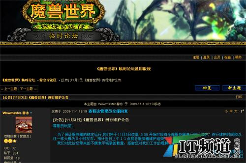 昨晚,記者在《魔獸世界》中文官網(wǎng)臨時論壇發(fā)現(xiàn),網(wǎng)易已于1號晚上發(fā)布《魔獸世界》例行維護(hù)公告,公告稱,為了保證服務(wù)器的穩(wěn)定運(yùn)行,將于11月3日凌晨 3:00 開始對現(xiàn)有全部服務(wù)器進(jìn)行例行維護(hù),停機(jī)時間預(yù)計(jì)為12小時左右。同時“客服電話服務(wù)”也將暫停12小時。 這比《魔獸世界》之前的例行停機(jī)維護(hù)時間稍長。