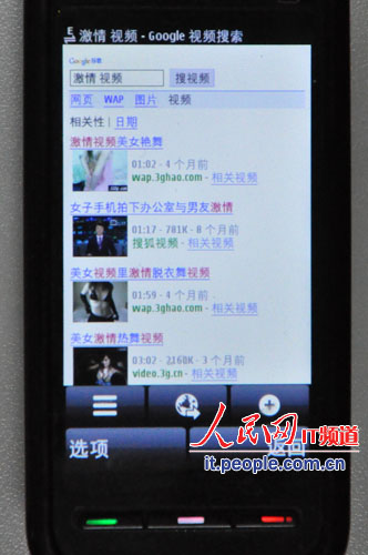 在搜索視頻內(nèi)容時,輸入“激情 視頻”后,手機立刻顯示出許多帶有不堪入目圖片的鏈接,其中第一個便是名為“美女視頻美女艷舞”,谷歌在這次打擊手機色情行動中的反應(yīng)可見一斑。