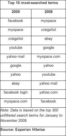 2008年,Facebook在該排行榜的排名僅為第10,而今年卻一舉超越去年的冠軍Myspace,成為最流行的搜索關鍵詞,Myspace退居第二。