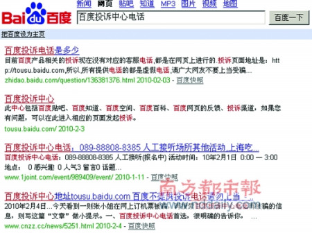 事態(tài)記者楊濤 報道 昨日,本報報道了山寨“百度投訴電話”被百度搜索置頂?shù)碾x奇事件,昨日,記者追訪此事時發(fā)現(xiàn),電話區(qū)號為“0898”的山寨“百度投訴中心”已經不再置頂,但昨日晚間搜索時,該網(wǎng)站仍然位列搜索結果的第三位。只是隨后的一條搜索結果提醒用戶,“百度不提供投訴電話,請勿上當”。被騙的張小姐得知此消息后亦哭笑不得。她表示對此事報警的目的不在于索賠,但網(wǎng)絡的管理實在有待加強。
