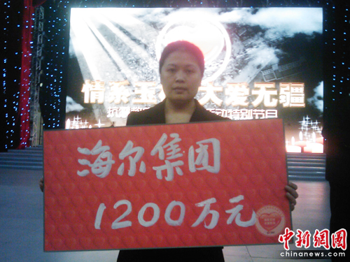 中新網(wǎng)4月21日電 4月20日,由中宣部、國家廣電總局、民政部、中國紅十字會主辦,中央電視臺承辦的《情系玉樹 大愛無疆--抗震救災(zāi)大型募捐活動特別節(jié)目》在中央電視臺現(xiàn)場直播。海爾集團在現(xiàn)場向災(zāi)區(qū)捐款1200萬元,全力支持災(zāi)區(qū)緊急救災(zāi)和災(zāi)后重建工作。