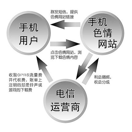 “簡單來說,一條手機(jī)色情信息內(nèi)容的發(fā)布,一般要經(jīng)過三個環(huán)節(jié):運(yùn)營商(主要是指各種手機(jī)圖片、鈴聲、視頻、文字、游戲等內(nèi)容發(fā)布平臺和渠道的提供者)、SP和WAP網(wǎng)站!北本┼]電大學(xué)一個曾長期關(guān)注移動增值業(yè)務(wù)的人透露,“SP在運(yùn)營商和WAP網(wǎng)站間牽線搭橋,三者已形成捆綁各方的利益鏈,一旦獲利,三方都有收益。”