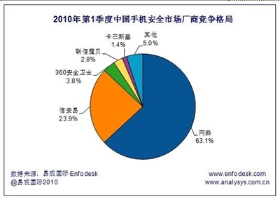在國內(nèi)的手機安全廠商中,網(wǎng)秦以63.1%的市場占有率名列第一,信安易占23.9%名列第二,360安全衛(wèi)士擁有3.8%的市場占有率名列第三。