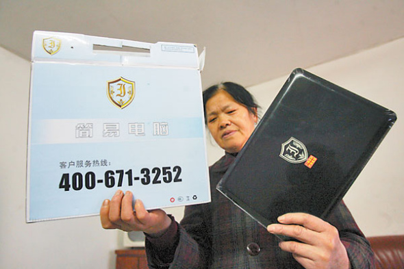 昨日,記者在大坪金銀街的湯大媽家里看到了這臺上網(wǎng)本。包裹上顯示的是由江蘇昆山市物流公司遞送的“10寸黑簡易電腦+蘋果手機+DC”,沒有發(fā)貨的公司名稱,只留有電話號碼400-671-3252。這臺黑色的上網(wǎng)本是塑料外殼,很輕很薄,沒有產(chǎn)品名稱,外面蓋上有“簡易電腦”幾個字,側邊有幾個USB 接口。