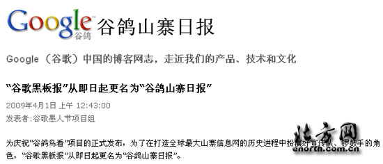 同時,為慶!肮萨濜B看”項目的正式發(fā)布,谷歌中國的官方博客“谷歌黑板報”也在今日“撰文宣布“改名”為“谷鴿山寨日報”。該博客稱:“為了在打造全球最大山寨信息網(wǎng)的歷史進程中扮演好宣傳隊、鑼鼓手的角色,‘谷歌黑板報’從即日起更名為‘谷鴿山寨日報’”。但記者注意到,該日志的發(fā)布者署名為“谷歌愚人節(jié)項目組”,想必“谷鴿鳥看”和“谷鴿山寨日報”的改名行動都是今天這個特殊節(jié)日的一部分。