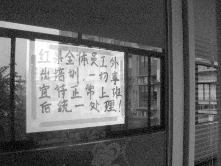 門上貼著一張告示,“紅果全體員工外出培訓(xùn),一切事宜待正常上班后統(tǒng)一處理”。記者透過(guò)玻璃看到,該公司的辦公用品還在。