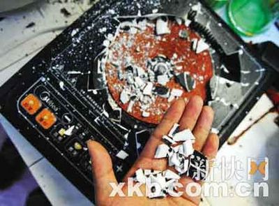 記者來到事發(fā)現(xiàn)場看到,爆炸的電磁爐放在廚房的灶臺上,破碎的磁片散落在電磁爐和地上。電磁爐正上方的抽油煙機有部分也被炸凹,一個小鍋掉在地上。在廚房外的墻上和地面,留有斑斑血跡,旁邊的鞋架也倒在地上。