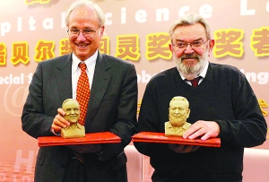 昨日,諾獎(jiǎng)得主馬丁努恩·韋爾特曼(右)和圖靈獎(jiǎng)獲得者巴特勒·萊普森(左)接受首都科學(xué)講堂送給他們的頭像雕塑。本報(bào)記者 浦峰 張濤 攝
