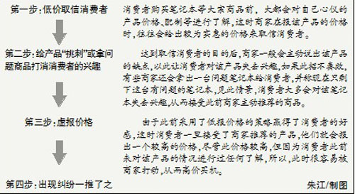 在中關(guān)村發(fā)生的大多數(shù)價(jià)格欺詐,都有著一種固定的套路。林漢鐘把這種欺騙手法歸結(jié)為“四步”。