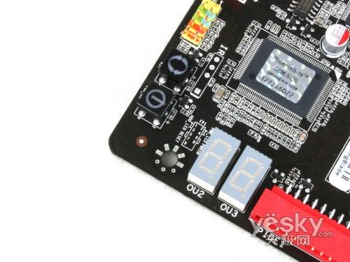 富士康FLAMING BLADE提供了電源、重啟按鈕和D-BUG指示燈,方便玩家在打開機(jī)箱進(jìn)行調(diào)試的時候開關(guān)機(jī)、重啟和排除系統(tǒng)故障。