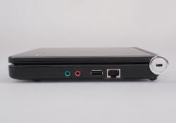 昭陽M10的機(jī)身側(cè)面接口比較簡單,但也涵蓋了基本的使用需求。機(jī)身前端沒有設(shè)置任何功能接口,不過內(nèi)置了一組雙聲道立體聲音響,在閑暇時放上一段舒心的音樂也是不錯的選擇。機(jī)身右側(cè)設(shè)置了一對音頻I/O接口、一枚USB2.0接口、一枚RJ45網(wǎng)絡(luò)接口以及轉(zhuǎn)軸上的安全鎖孔,左側(cè)除電源插孔外還加入了VGA視頻接口、SD讀卡器以及USB2.0接口,足以滿足外接存儲設(shè)備或顯示設(shè)備的需要。