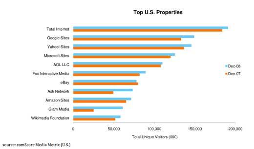 約翰·多納霍(John Donahoe)2008年一季度執(zhí)掌eBay后提倡“大幅更換產(chǎn)品、消費(fèi)方式和業(yè)務(wù)模式”,在與亞馬遜和谷歌的失敗競(jìng)爭(zhēng)中,eBay領(lǐng)導(dǎo)層徹底放棄了殘存的娛樂(lè)元素。2008年12月,eBay占網(wǎng)民網(wǎng)絡(luò)瀏覽時(shí)長(zhǎng)比率僅為1.5%。按獨(dú)立訪(fǎng)問(wèn)者數(shù)量排名,靠前的網(wǎng)站分別是谷歌(YouTube母公司)、福克斯互動(dòng)傳媒(MySpace母公司)等,eBay僅列第六位,與2007年12月數(shù)據(jù)相比,是十大網(wǎng)站中唯一出現(xiàn)排名下滑的網(wǎng)站。(見(jiàn)圖)
